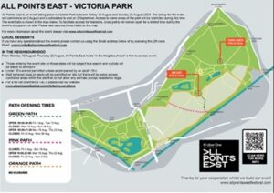 The new contract they have approved in early 2024 means a significant expansion in the number of major event days, potentially doubling them by 2026. The council expects to generate £1.588 million from commercial event activity in 2024, and the rationale for expansion includes the notion that they are competing with other councils and don’t want to lose AEG contract. The event site is well over the 10% of the park areas as you can see from this map. Image showing (the light grey areas) the scale of All Points East event in Victoria Park