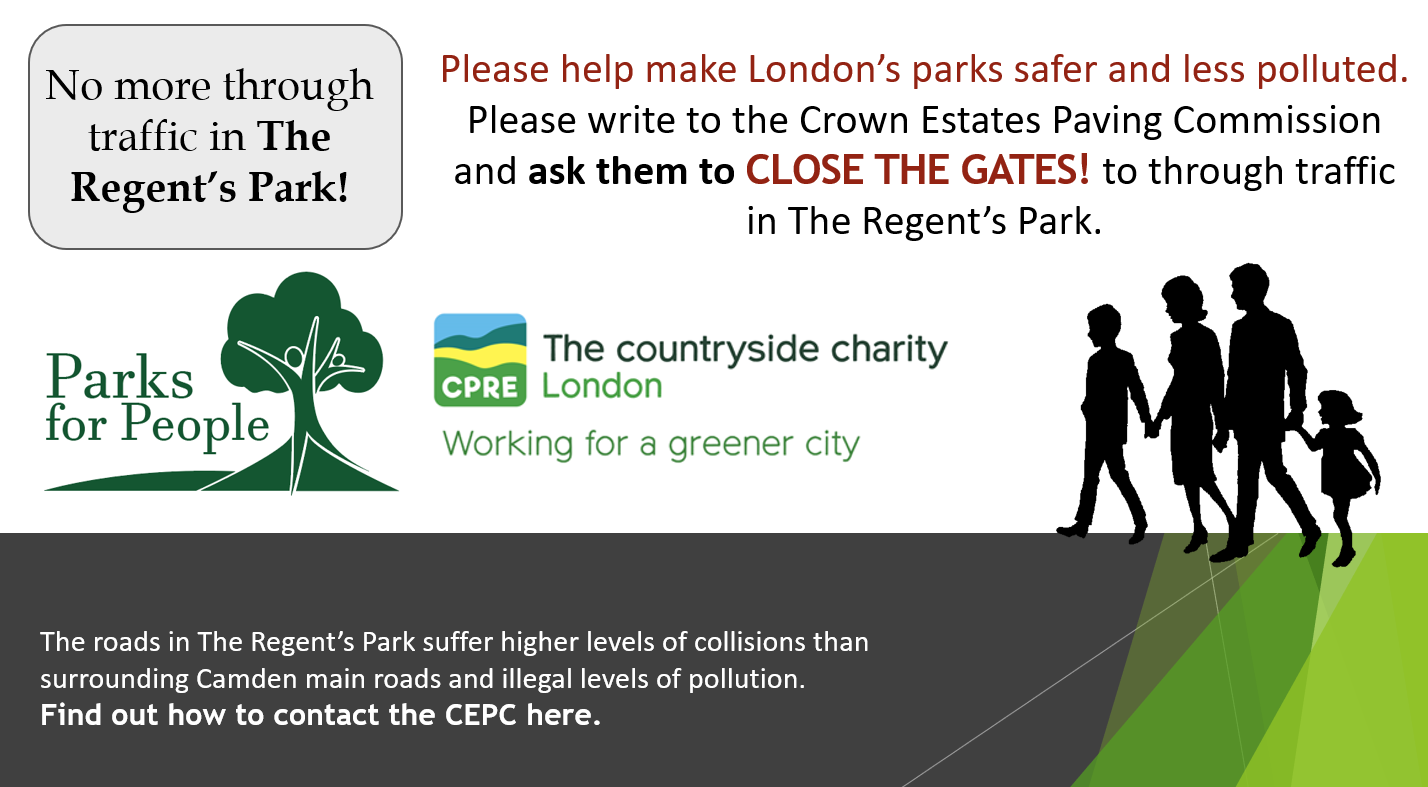 Parks for People is a relatively new group but one which is supported by CPRE London, the pedestrian campaign Living Streets, Ramblers, Mum for Lungs, Sustrans and many others. We believe through-traffic should be removed from parks to ensure they are peaceful places with clean air, free from traffic noise and road danger and oases for walking, cycling and recreation.